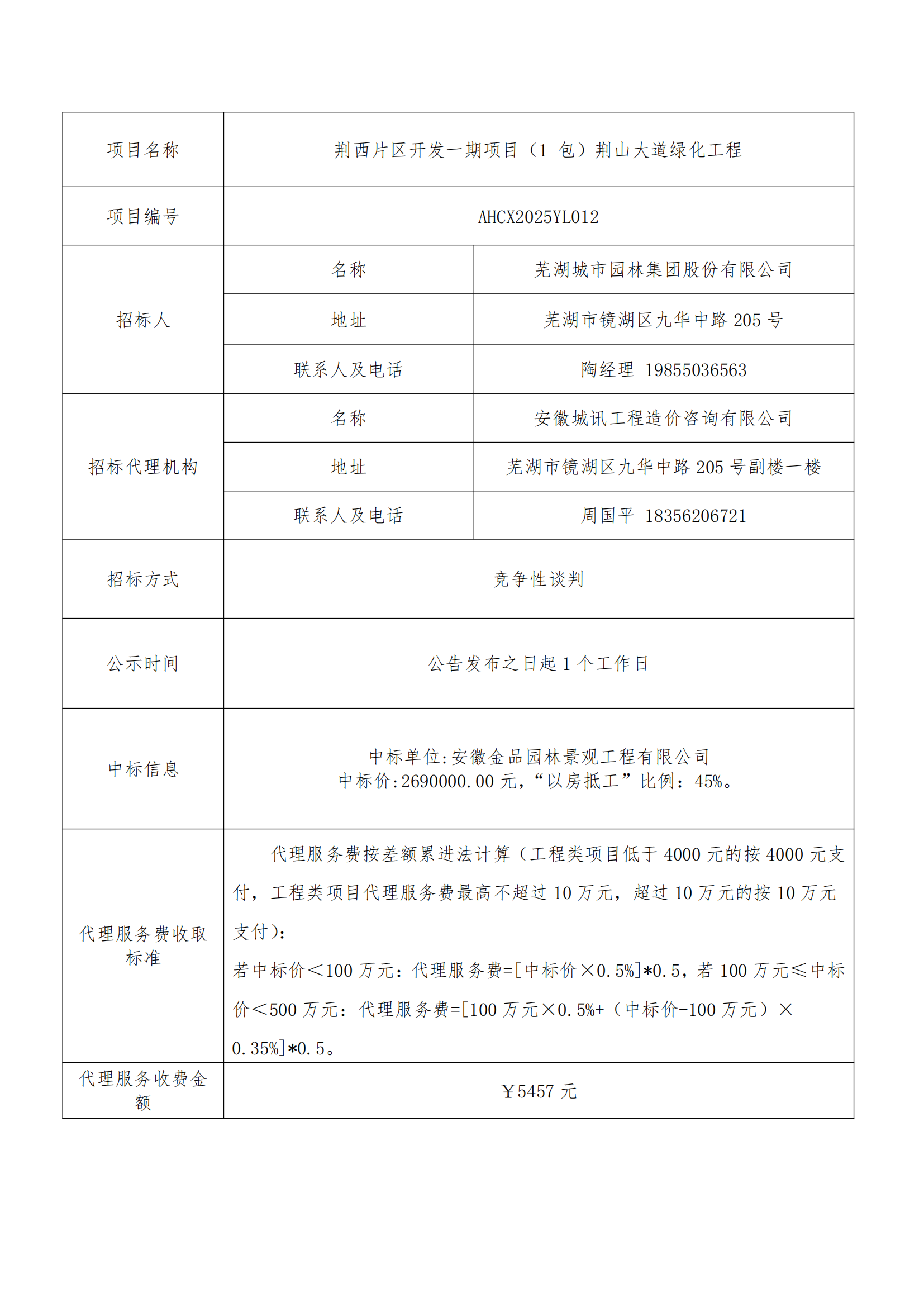 荊西片區開(kāi)發(fā)一期項目(1 包)荊山大道綠化工程中標結果公示