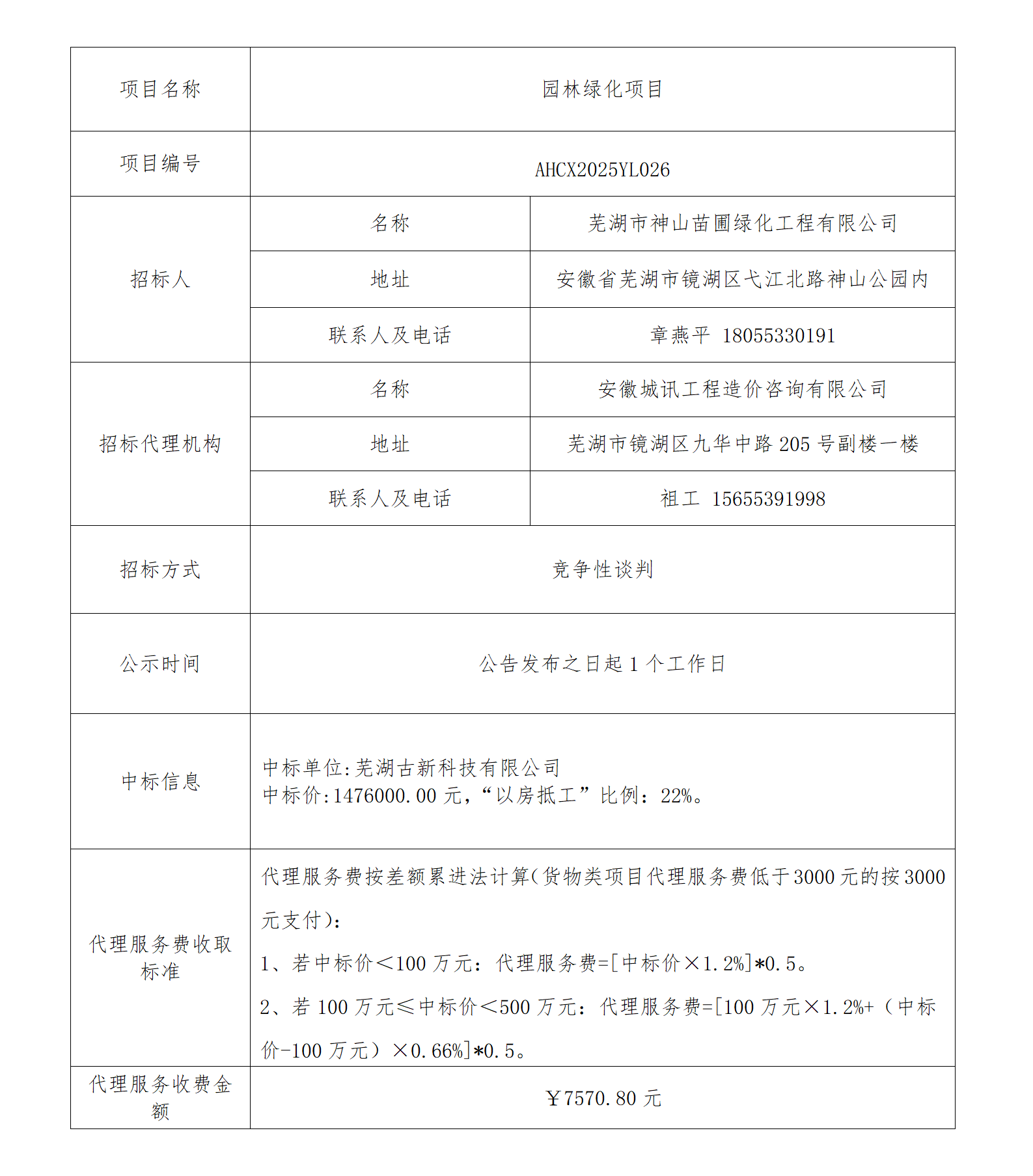 園林綠化項目成交結果公告