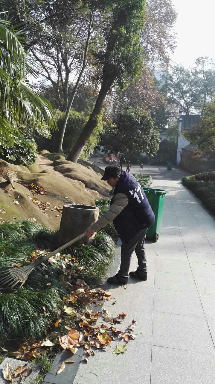“掃”。公司上下進(jìn)行總動(dòng)員,對相對集中的落葉用大掃把清掃,落在草叢中的樹(shù)葉用耙子耙,對綠化隔離帶中少量無(wú)法用工具打掃的落葉,則用手撿。