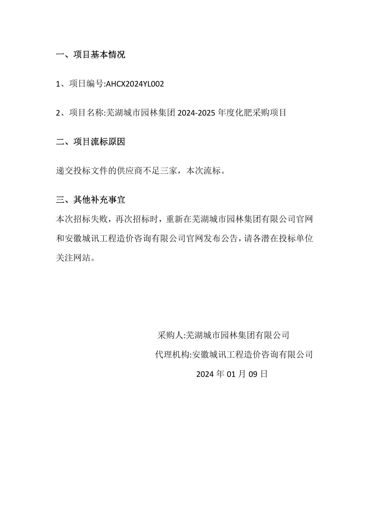 蕪湖城市園林集團2024-2025年度化肥采購項目流標公告