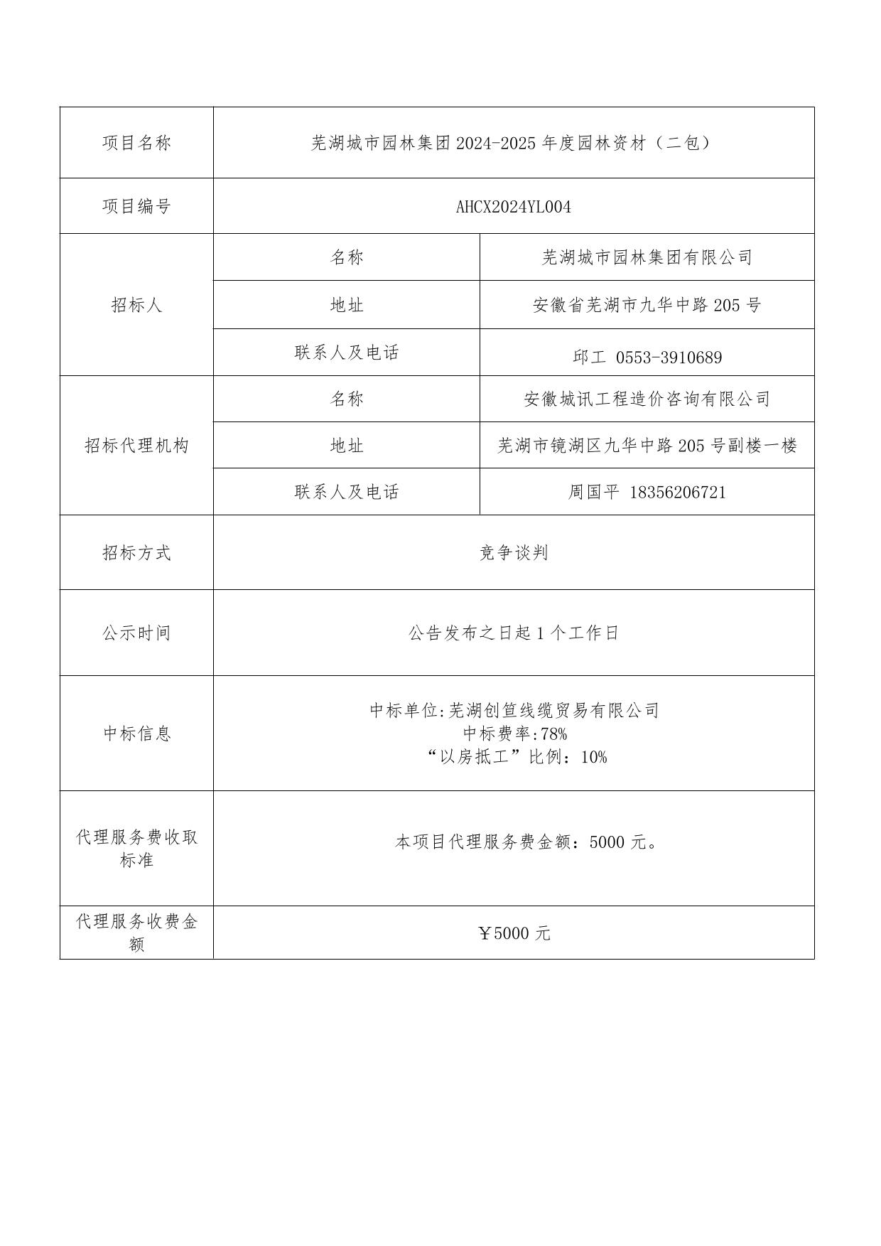 蕪湖城市園林集團2024-2025年度園林資材(二包)成交結果公示